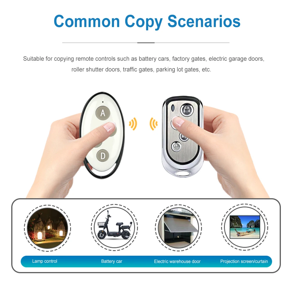 1. Versatile and Personalized Design: This remote control duplicator offers a multifunctional, customizable, and user-friendly design. It can be quickly mastered and used for various applications such as battery cars, electric doors, electric barriers, electric garages, security monitoring, lighting remote control, etc.