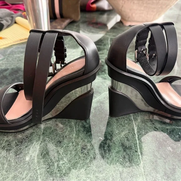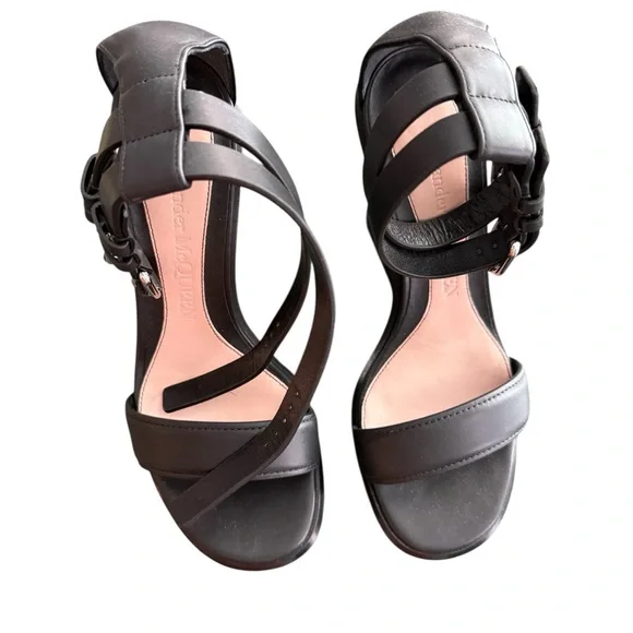 Experience the avant-garde design of Alexander McQueen with these black wedges, featuring a dramatic curved heel and sleek double black straps. The unique architectural silhouette is both modern and striking, making these shoes a standout addition to any fashion-forward wardrobe. 3.3” wedge heel with silver inlay Made in Italy Calf leather with silver inlay and buckles See video for perfect condition 37 1/2Retail 1,050