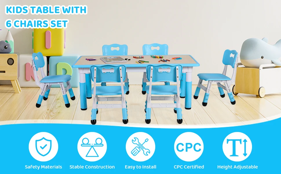 [Multifunctional Table and 6 Chairs Set] Your child can draw, do crafts, eat and drink or just do anything with this table and 6 seats set. It provides a relaxing space for your baby to unleash their artistic potential. Both the table and chairs are adjustable in height to grow with your child.