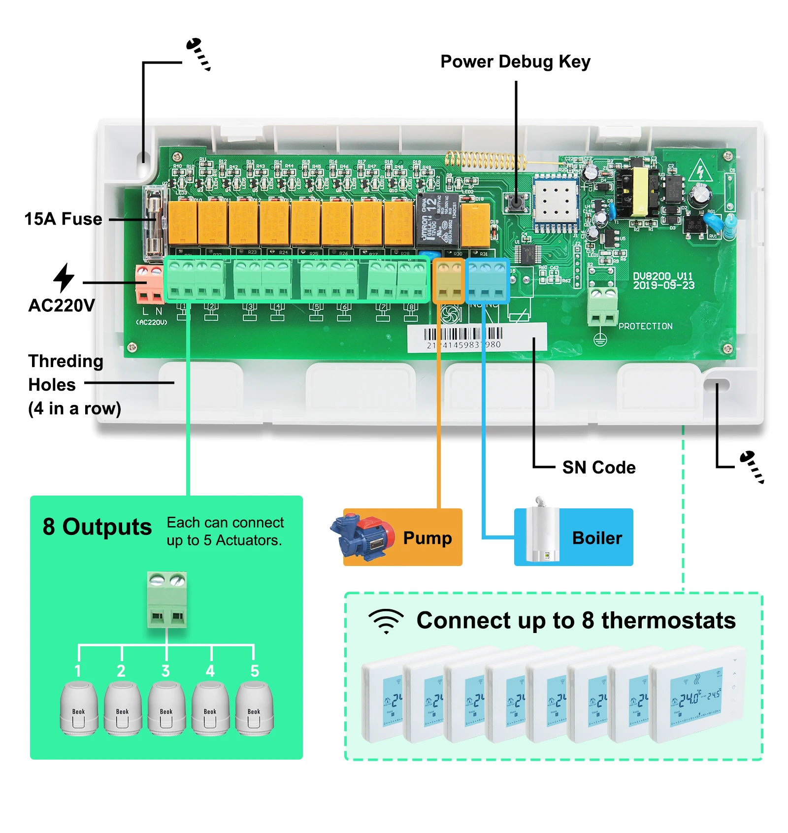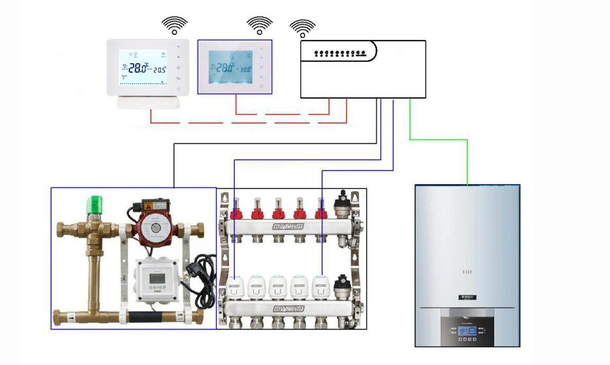 The CCT-10-X hub works together by connecting the boiler, water pump, actuator, and temperature controller. When the temperature controller detects the need for heating, it will send a heating signal to CCT-10-X. CCT-10-X will control the boiler and pump to turn on, and also control the corresponding room's actuator to turn on, allowing hot water to flow into the room that needs heating.