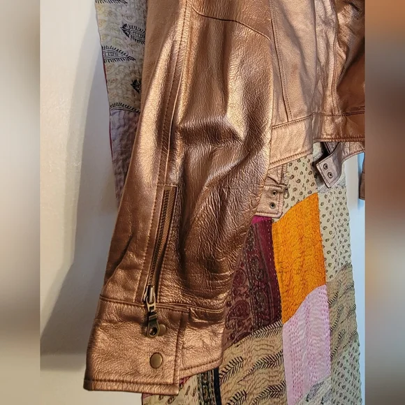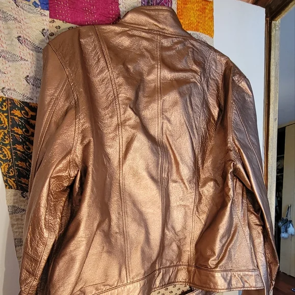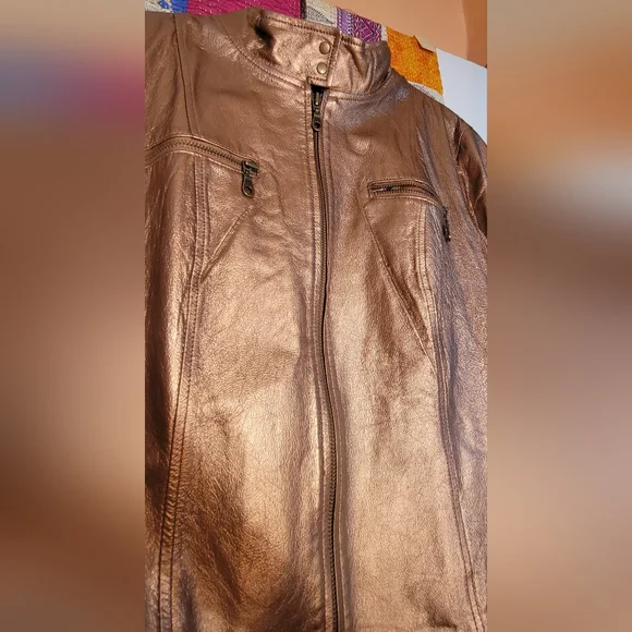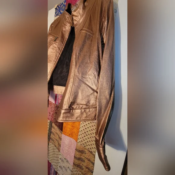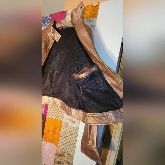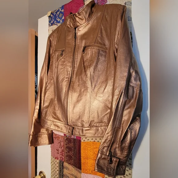 Super cool unusual biker jacket in genuine leather in a luxurious shimmering metallic copper color. Fine antique brass zippers and hang tags. Two deep chest pockets with zippers, one interior pocket with neat leather trim. Cooling black mesh lining. Double snaps at upright mandarin collar. Double snaps at waist and sleeve cuffs. Zips and tabs at sleeves too. Soft, pliable leather. Great for layering and cool coverage over tank tops. All season. As new. A great buy!😎