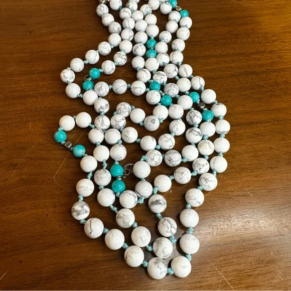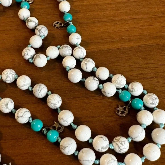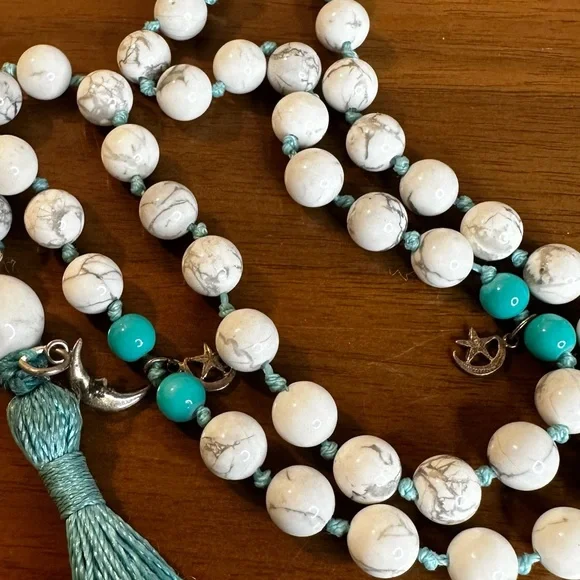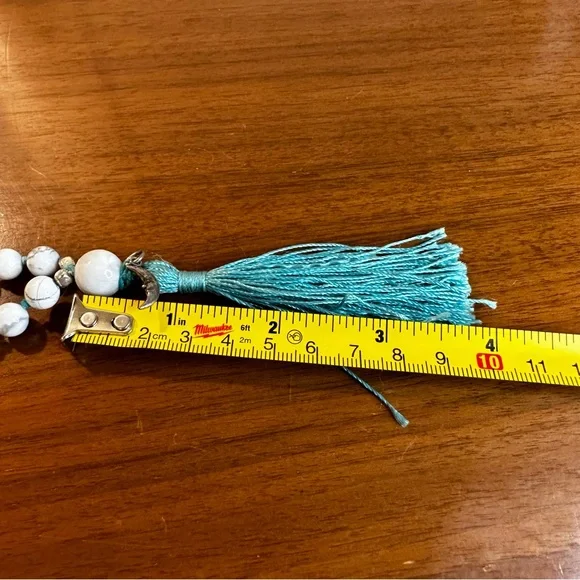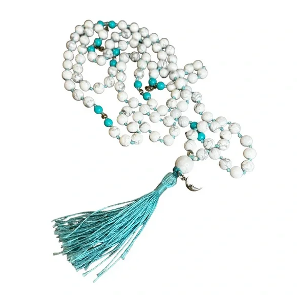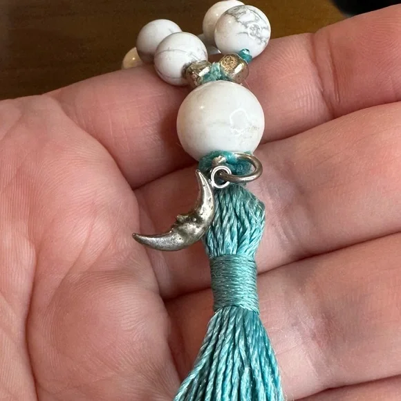 Boho Howlite Stone Sterling Silver Moon Celestial Charm Tassel NecklaceGenuine howlite and turquoise bedaed stone long necklace with celestial moon and stars sterling silver 925 charms and tasselThere are a couple of strings in the tassel that are frayed, can easily be cut out if desired. No other flaws52" wearable length Tassel just under 4"
