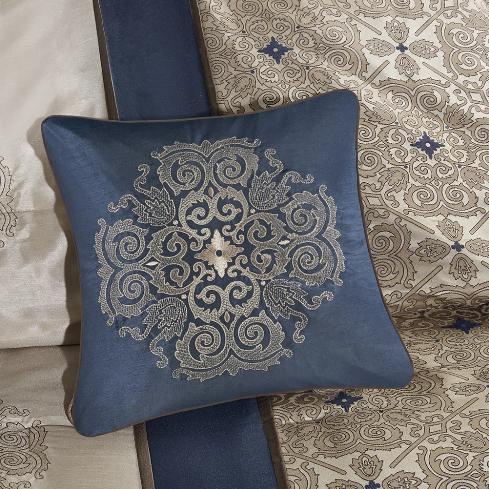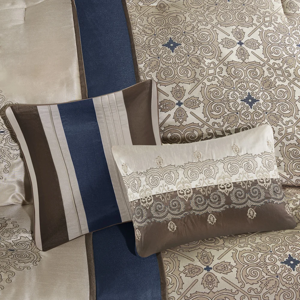 Classically stylish, the Madison Park Donovan 7 Piece Comforter Set turns your bedroom into a luxurious getaway. The jacquard woven comforter showcases an elegant color palette in navy, taupe, ivory, and brown accented three embroidered medallions. Matching shams coordinate beautifully with the top of the comforter, while a brown bed skirt provides extra charm to the bedspread. A solid brown reverse adds a bold and neutral touch to the comforter set. Three decorative pillows feature fabric manipulation and embroidered details to complement the design, completing the ensemble. Items in the set may come in a rolled or compressed packaging, which will need to be fluffed up or steam ironed before use to remove wrinkles.