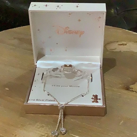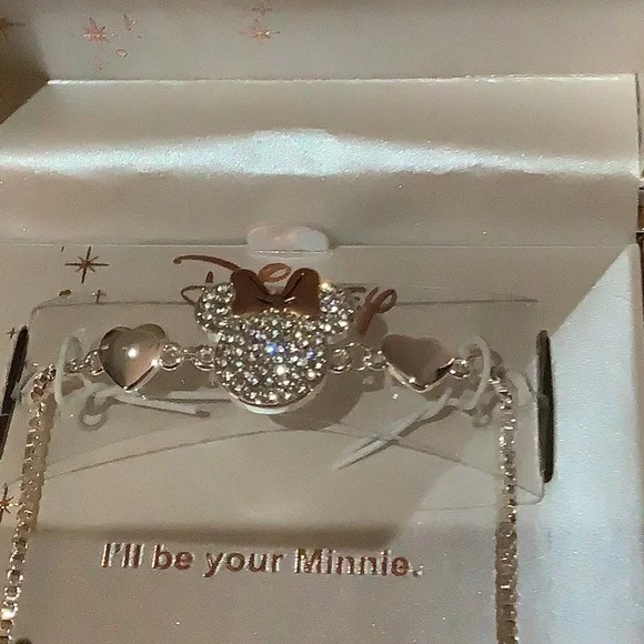 Beautiful Disney adult bolo bracelet in fine silver plated finish with pave crystal and rose gold accents.“I’ll be your Minnie” is the sweet theme of this collectible Disney piece which bears two hearts, with one on each side of Minnie’s pave crystal accented head.The bolo fastener also proudly displays a small, embedded crystal on the right silver plated bead pull.Gorgeous gift for the Disney lover and woman you love!