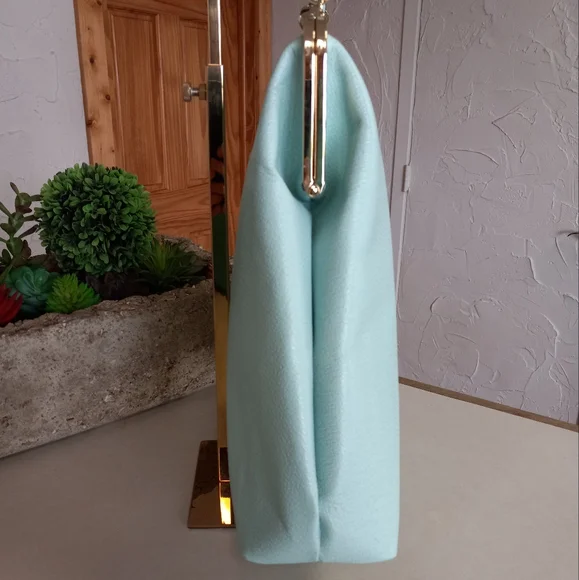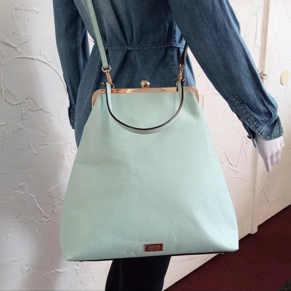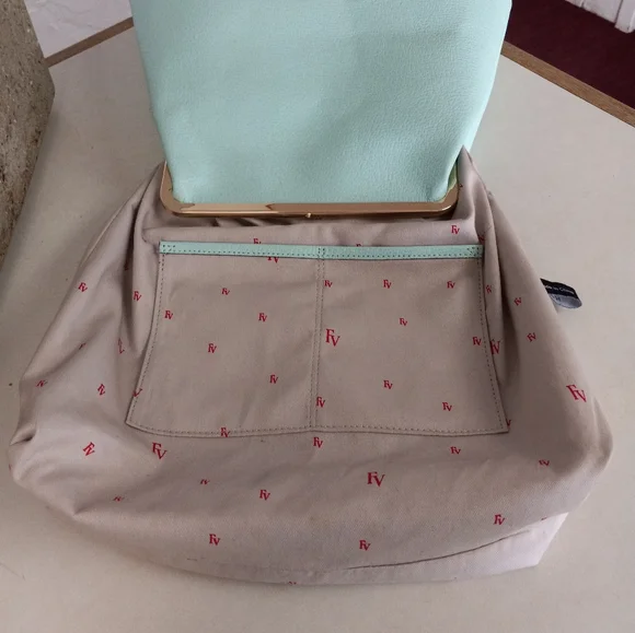 Frances Valentine Large Frame Caroline, Boarskin Bag, Light Aqua.The condition is very nice, has normal surface wear, nothing stands out. This bag is no longer in circulation. She is rare, and in this color. The frame, and gold tone FV dome ball work great. Top handle is not removeable. The crossbody strap is adjustable and removeable. The interior, is clean, and has the FV signature fabric. One large full width zipper pocket and on the other side, is a nice slip pocket. Very spacious and lightweight!!!This frame style bag is classic and beautiful!!!Size: 13h x 12w x 4dComes in a FV dust bag