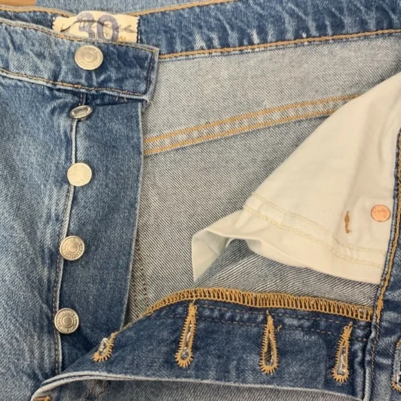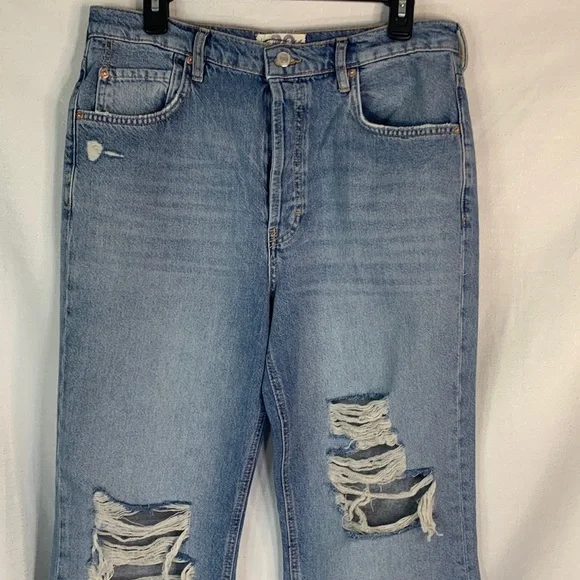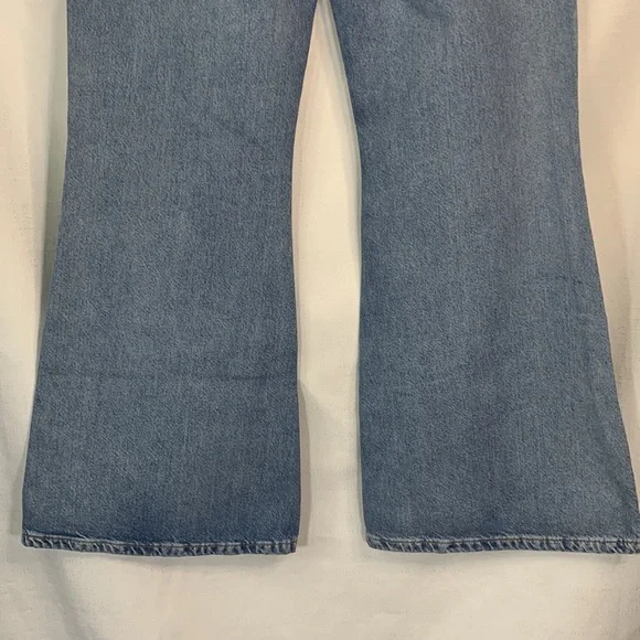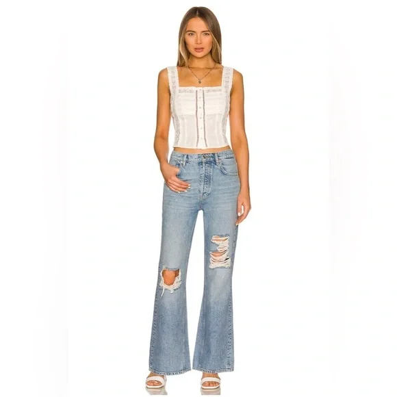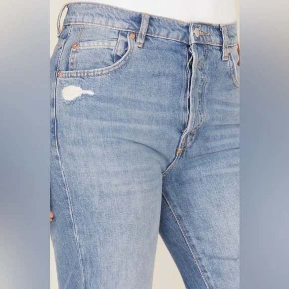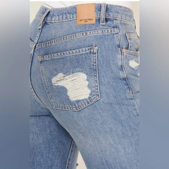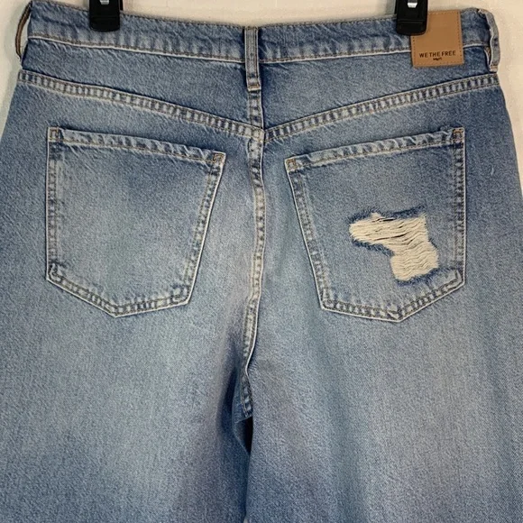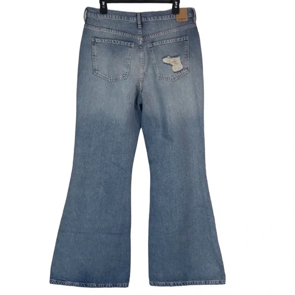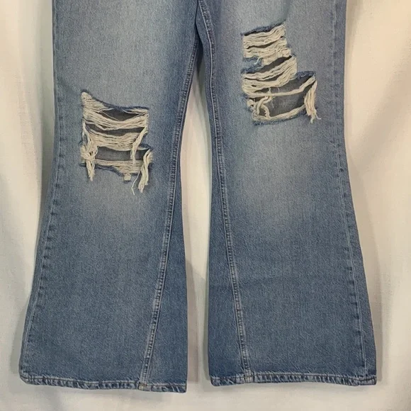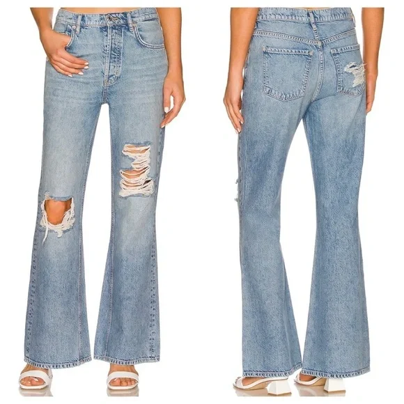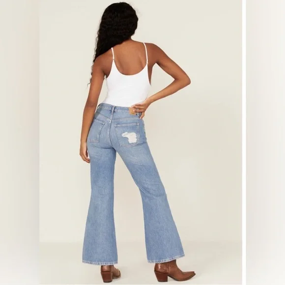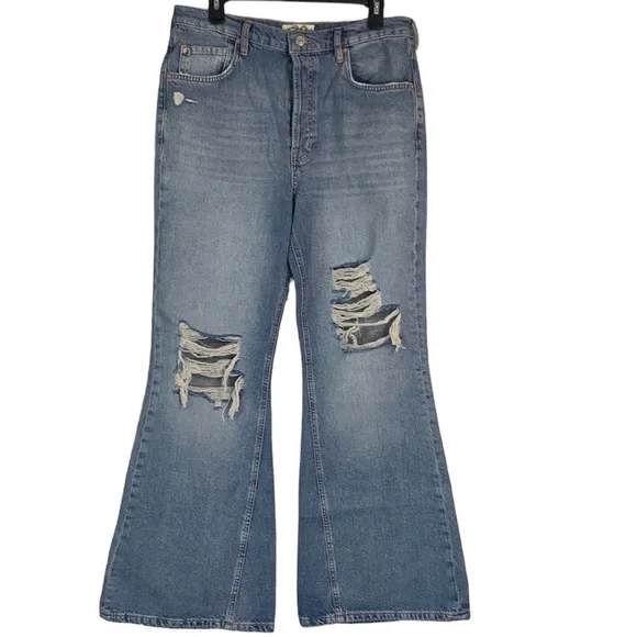 Awesome holey flared jeans by Free People! High Rise with 5 button fly. Faded throughout the leg and whisker at the hip. Holes at knee and thigh, along with small detail at front and back pocket. Major vibes on these; make these all your own and style in so many fun ways! Purchased wholesale, so new, just without tags.Approximate Measurements:Waist: 16Rise: 12Inseam: 31Hem: 12-1/2Be sure to use the filter function to find more pieces in your size & style. Bundling encouraged for best cost;shipping valid up to 5 pounds!