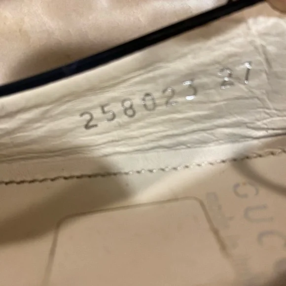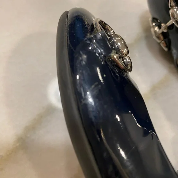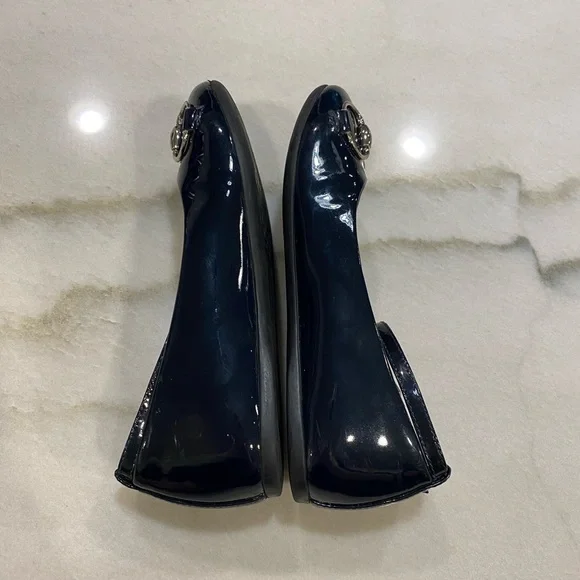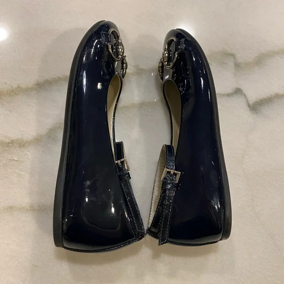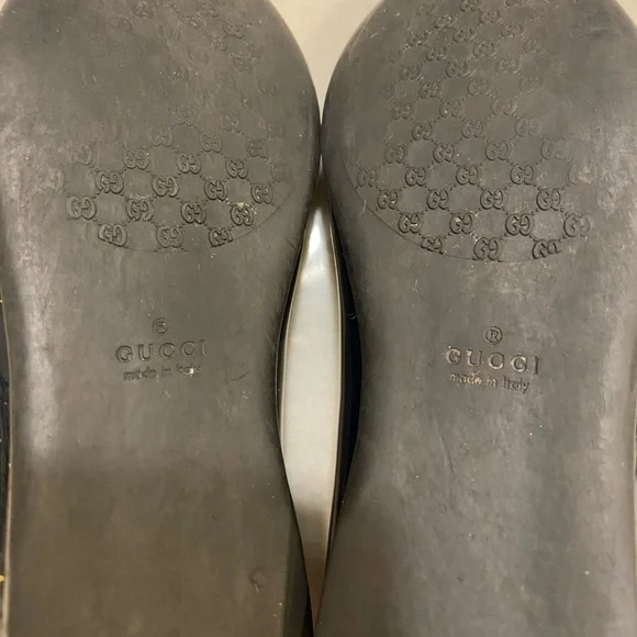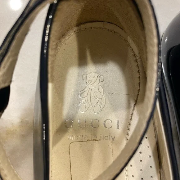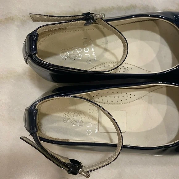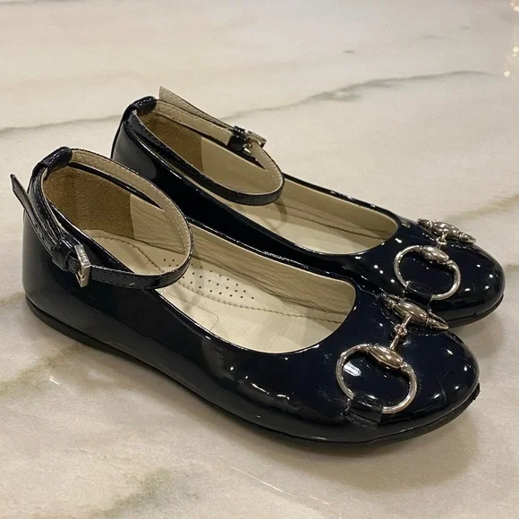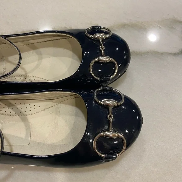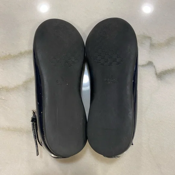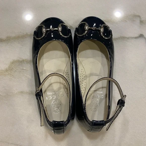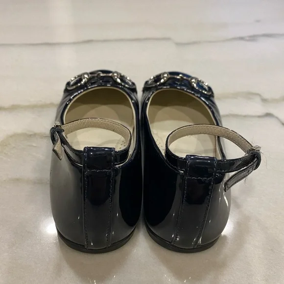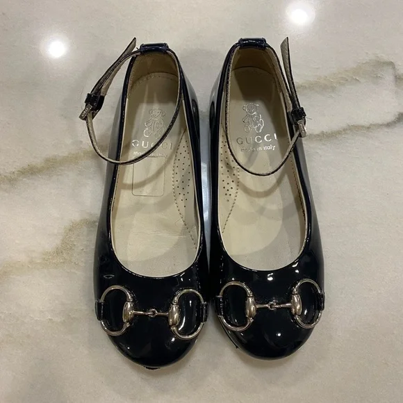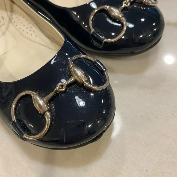 Gucci Toddler Girls ballet flats in size 27, US size 10.5. Black patent leather with Horsebit design on top. Adjustable ankle clasp closure. Only flaws are a few scuffs on side and at top of toe, which are not very noticeable. Wear on soles shown. Only worn a few times. Overall good condition.