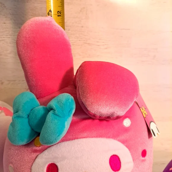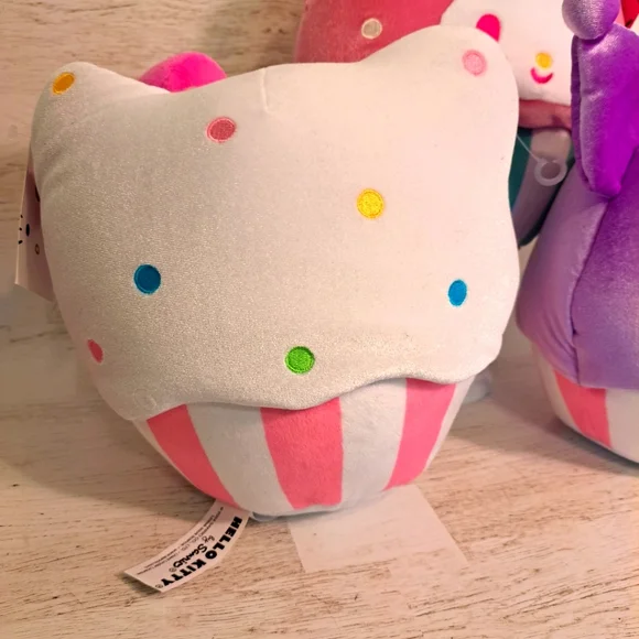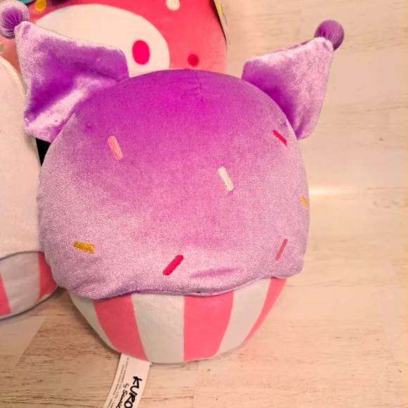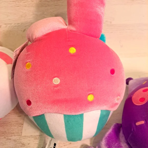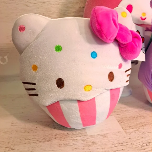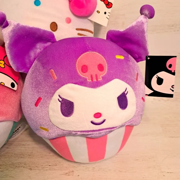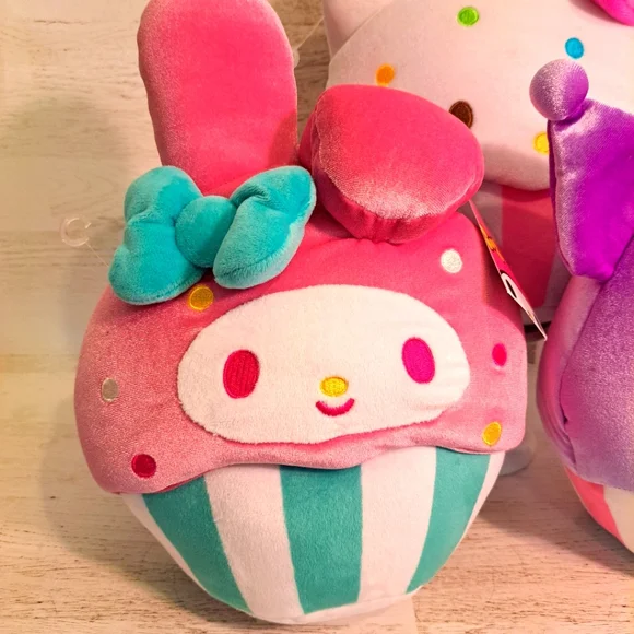 Get the whole collection of these sweet cupcake plush. These soft plush features Kuromi, My Melody & Hello Kitty as a sweet cupcake with rainbow sprinkles! Kuromi sits in a pink-and-white striped baking cup, wearing her iconic purple jester’s hat. My Melody sits in a green-and-white striped baking cup, wearing an electric-blue bow. Hello Kitty sits in a pink-and-white striped baking cup, wearing her iconic pink bow. GUND Sanrio toys make cute home decor and great gifts for teens, Hello Kitty fans, and collectors of kawaii plush. Whether it’s for desk decor, a birthday gift, anime merch, or just because, gift a lifetime of hugs with a GUND.d.