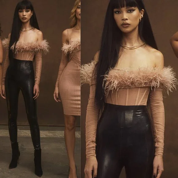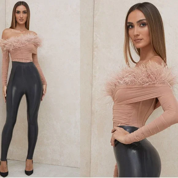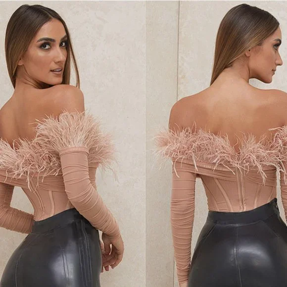 This sold out gem is stunning!!! It has such a romantic and elegant feel with a touch of glamour. Cut from a super soft stretchy mesh. It sits elegantly off the shoulders in an asymmetric design and edged with beautifully swaying feathers. The bodice is boned down to the waist and has underwired bust shaping so don't need for a bra. You'll love the way the overlapping of our super soft mesh is ruched and draped across the bust and left arm. It is fully lined with a stretchy power mesh that sculpts the figure from within to act like built in shapewear so really cinches the waist in. The briefs have a thong shape that's also made from power mesh for a comfortable and smooth seam free fit. Zip to the back for easy on and is also piped in duchess satin to prevent feathers being caught. Perfect for that extra special date night.Made from stretch mesh. Fully lined. Stretch Factor: 3/3 Length: Approx 49cmMaterials: Powermesh (80% Polyamide, 20% Elastane) Single Duchess Satin (100% Polyester) Feather (100% Ostrich Hair) Soft Mesh (85% Polyester, 15% Elastane)Specialist Gentle Dry Clean Only Model is 5 ft 9.5 and wears size XSThis bodysuit is brand new, the inside tag has been cut in half