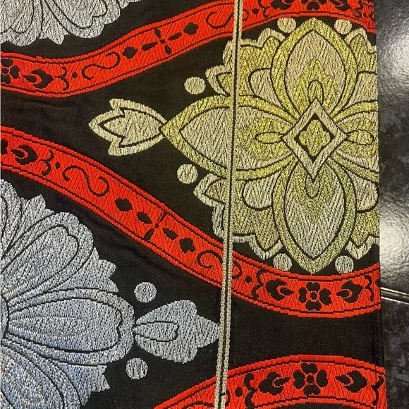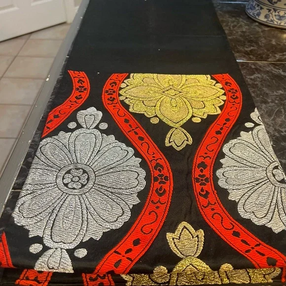 Beautiful Black and Red Silk with silver and gold threads. Antique Obi purchased in my travels. Total length is 156” x 12”. When shipped will fold to approximately 12”x12”. I had this piece hanging on a wall so there is a 3 1/2” hem at top. It can be unsewn by you if you want full length. Purchased in travels. I have around 20 and downsizing!I used them as table runners also.See last picture!NOT FOR SALE!