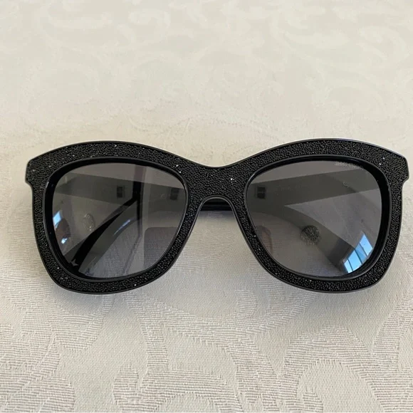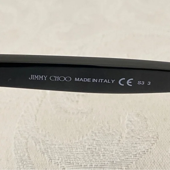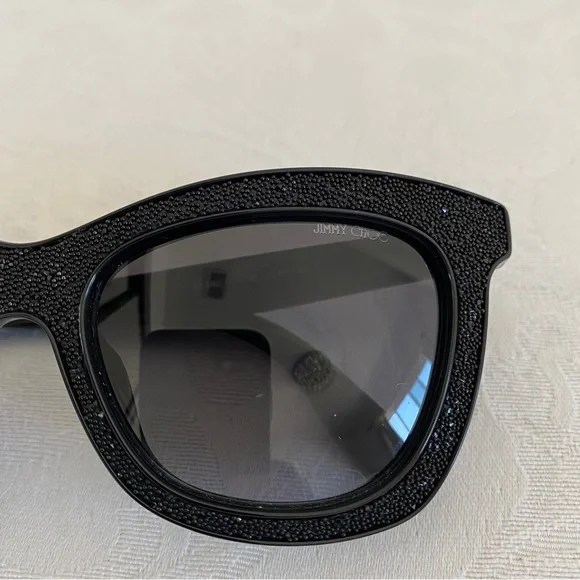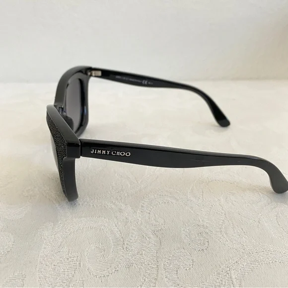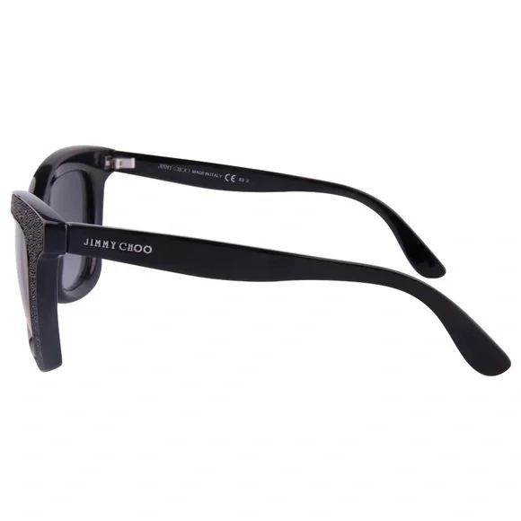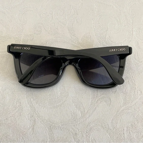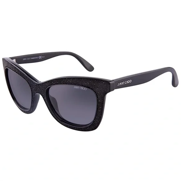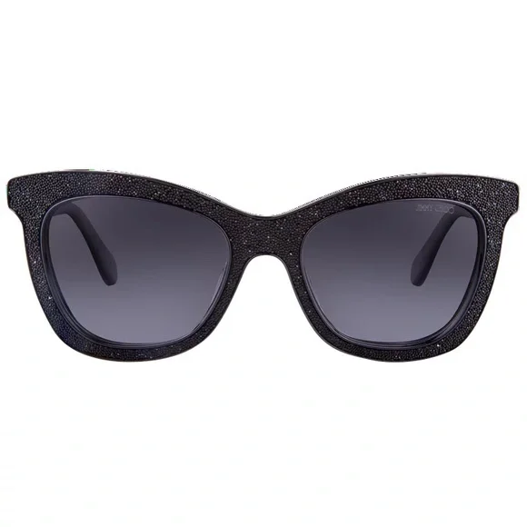 A sleek and stylish design for a trendy accent with any look. These versatile sunglasses feature a cat eye style frame in shiny black acetate with complementing gray gradient lenses. Highlighting the arms at the temples is the signature Jimmy Choo logo for a classic touch. Fashionable and eye-catching, these Jimmy Choo sunglasses are the perfect accessory for protecting your eyes in style.No defects