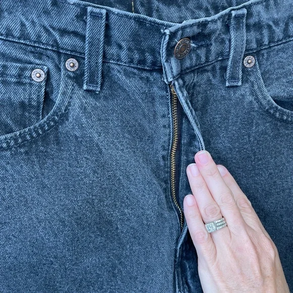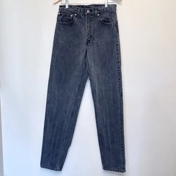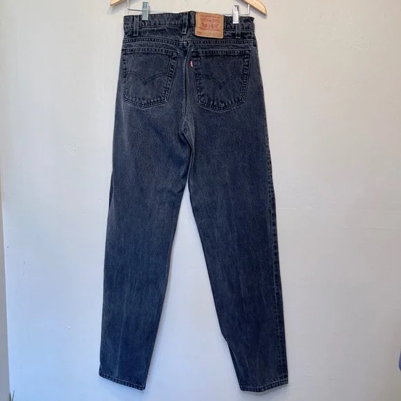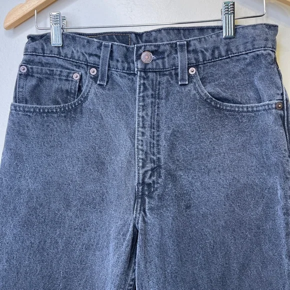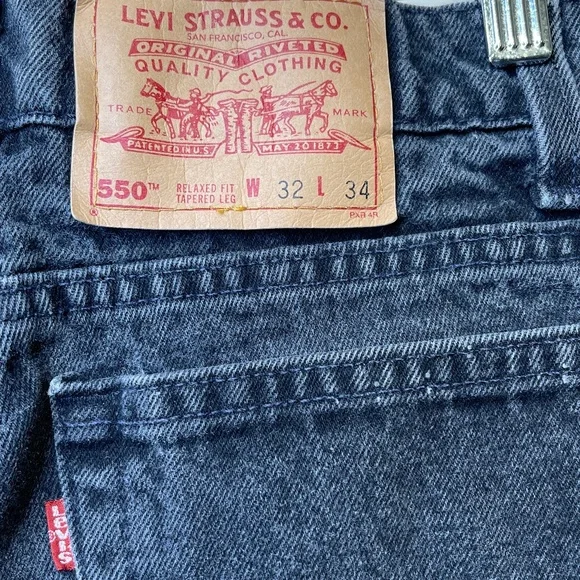 Levi’s 550 Vintage Distressed Washed Black Charcoal Relaxed Tapered Fit Classic 5 Pocket Zip Fly Single Button Closure High Waisted Tapered Ankle Boyfriend Punchy Western Westerncore Coastal Cowgirl Festival Americana Casual Wedgie Mom Unisex Jeans Color: BlackMaterial: 100% Cotton (Made in USA)Size: 32x34 (Vintage sizes run smaller than current apparel sizing, see measurements).Approximate Measurements:Waist 15" Hips 20"Front Rise 12" Inseam 34"Condition: EUC, vintage. No trades please.