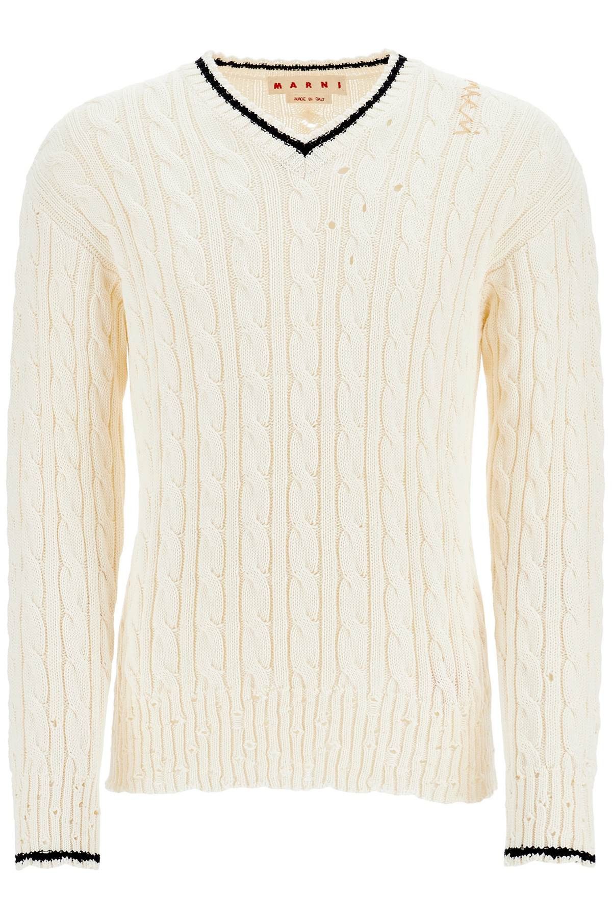 The MARNI men's sweater offers contemporary elegance. V-neck with contrast border, cable knit and high-quality Italian cotton. Versatile design for sophisticated and casual looks.