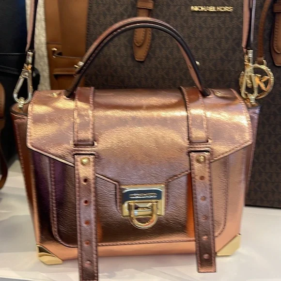 MICHAEL KORSManhattan Medium TH SCHOOL Crackled Metallic Leather SATCHEL Crossbody Mocha NWT New with the tag Authentic The Manhattan satchel lends modern appeal to the classic trunk bag style. Skillfully crafted. A flip-lock closure opens to reveal an exterior front slip pocket that provides easy access to your phone.• Satchel • Gold Tone Hardware • 10"W X 7.25"H X 4"D • Adjustable strap: 19”-21” • Exterior details: front slip pocket • Interior details: back zip pocket, front slip pocket • Lining: 100% polyester • Flip-lock fastening • Dust bag not included • ImportedMICHAEL KORSMANHATTAN35H3GNCS6MMOCHA MD TH SCHOOL SATCHEL