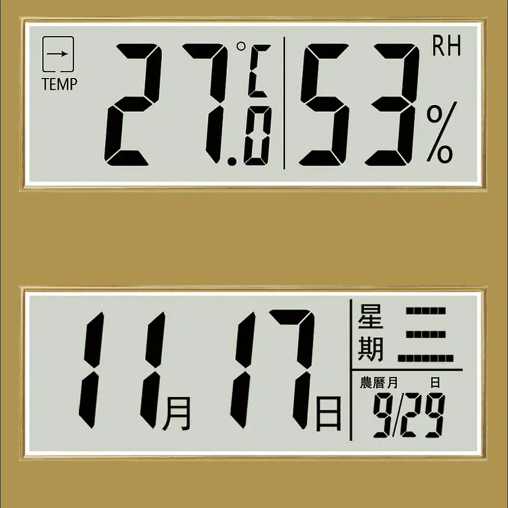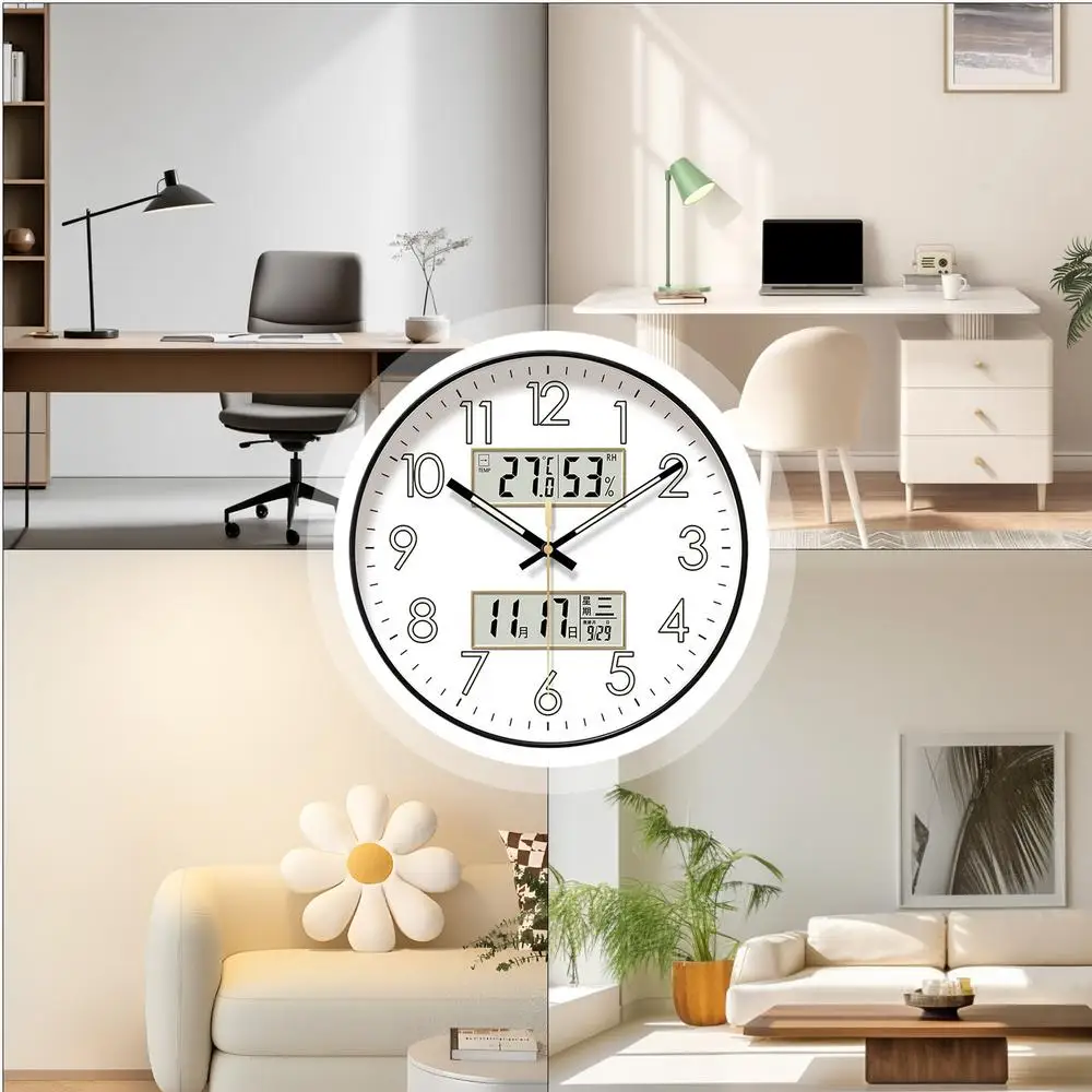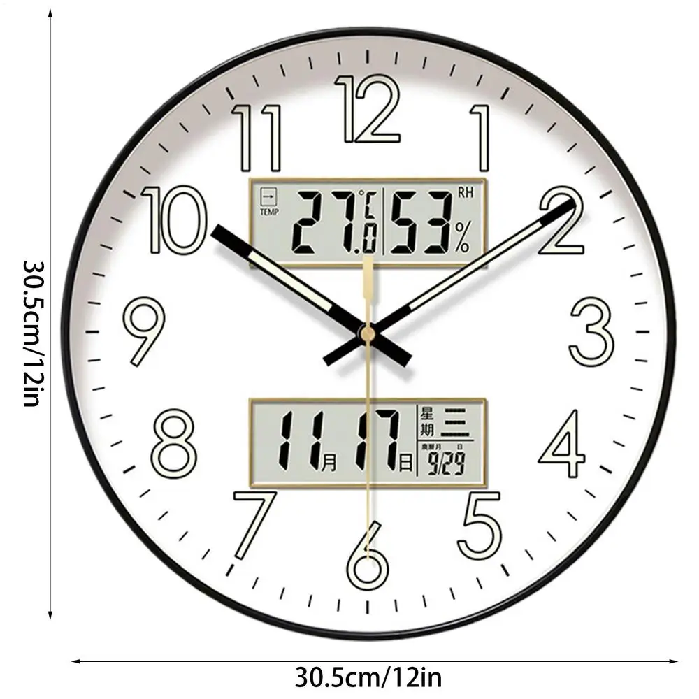 2.Efficiently Monitor Your Surroundings: Integrating temperature, humidity, and perpetual calendar functions, this silent wall clock presents detailed data on its clear digital display, meeting various needs for daily convenience. Perfect for modern homes