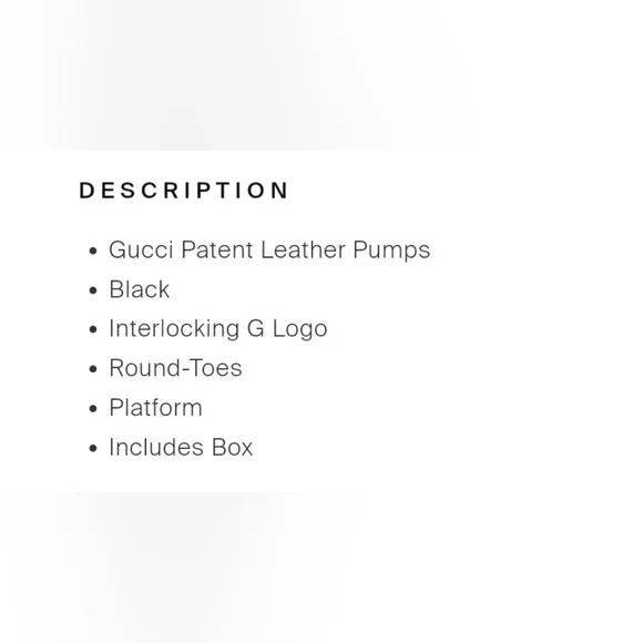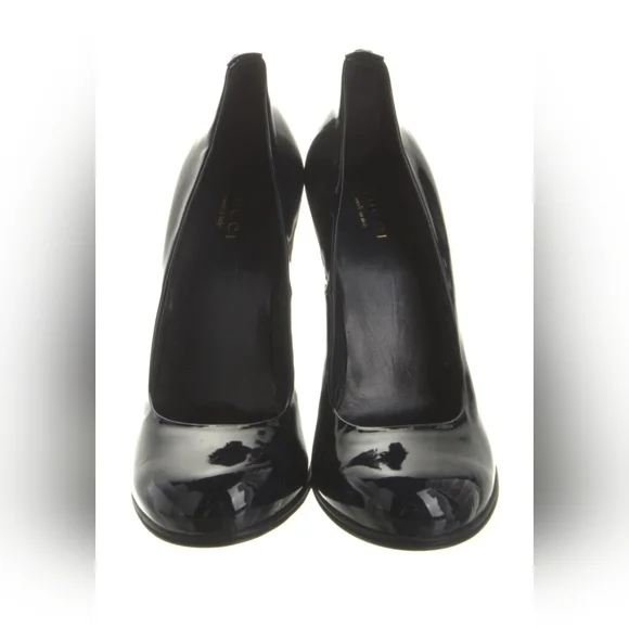 NWOT Never worn, tried on...minor marks. Made in Italy. Without box/dustbags. Black genuine patent leather with GG gold back heel logo. Approx, 4" heel. Affirm/PayPal available for purchases over $50. Size chart added for reference. Please view pics and ask any questions. B/Y Tote*****CHECK OUT OTHER LISTINGS AND BUNDLE FOR SHIPPING SAVINGS*****Tags:Jeans khakis pants sweaters hoodies sweatshirts dresses skirts slacks shoes suits sandals heels sneakers boots shirts tops blouses jackets coats blazers purse handbag bag clutch wristlet jewelry hair neck scarves wraps cardigans shawls shrugs accessories denim earrings lingerie watches hats caps.