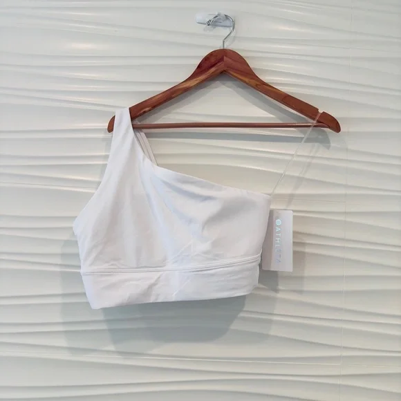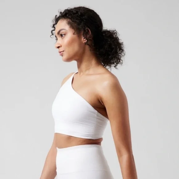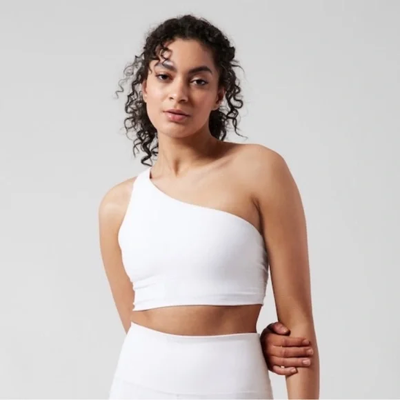 Athletic Athleisure Minimalist Strappy One Shoulder Athleta Athena Bra-BEST FOR STUDIO: yoga + barre + pilates-IMPACT: Light-impact workouts, best for A-C cups-FEEL: Powervita fabric is buttery soft with support that feels like a gentle hug-FAVE: One shoulder & strappy design detail for freedom of movement & stylish-MEDIUM COVERAGE: Mid-rise neckline strikes the balance between concealed and revealed-BREATHABLE: Airflow moves easily through the garment-QUICK-DRYING: Dries in a flash for ultimate comfort when breaking a sweat-WICKING: Pulls sweat away from the body to the surface of the fabric so it can evaporate-COMPRESSION SUPPORT: Keeps you held in and supported in all the right places, removable cups-Machine wash and tumble dry (I would hang dry)-size L-this is so gorgeous you could wear it without anything over it-will include more than one nice gift with purchase, please check out reviews-SOLD OUT ONLINE & IN STORES, RARE