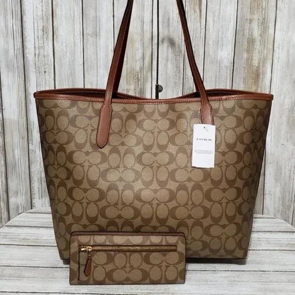 New w tags & care books, Coach Reversible Rainbow City Tote & Matching Wallet! Super cute reversible tote with magnetic disc closure. Has a flap pocket inside- signature jacquard coated canvas with leather trim and straps. Front distressed rainbow logo! Bag is 17" wide across the top & 12" tall.Wallet snaps closed with 12 card slots, leather lined, 4 billfold pockets. Wallet is also new w tags and is 8" wide x 4" tall100% authentic🚫NO TRADES 🚫