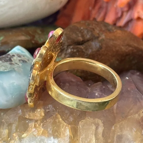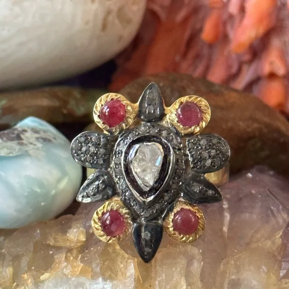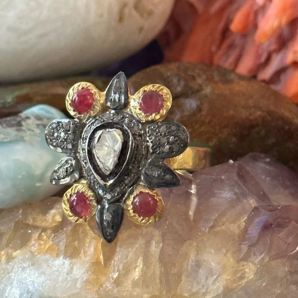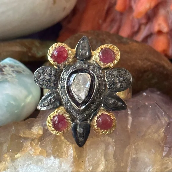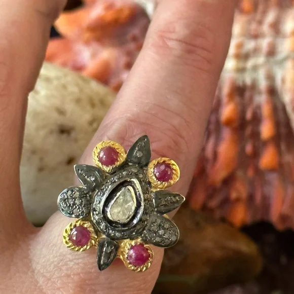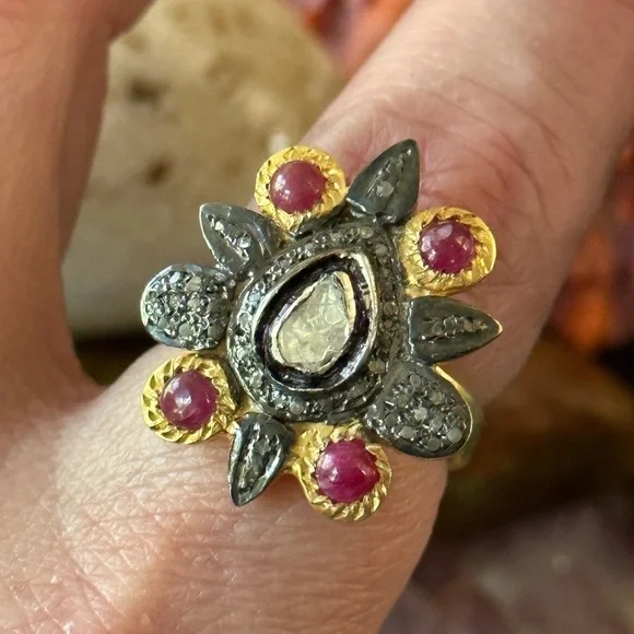 Why pay the gold prices when you can have the gold look in this beautiful ring that is guaranteed 925 solid sterling silver gold over sterling. It's ring is sensational with earth. Mind diamonds and natural rubies. Pokey diamonds are mine from the earth. absolutely beautiful. This is an artisan made. This is no stamp by guaranteed artist said 9 to 5 solid sterling silver, an absolute beauty highly recommend this piece.