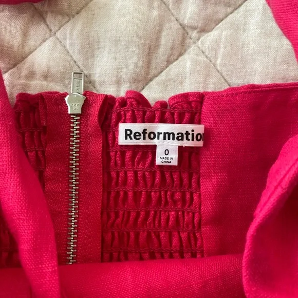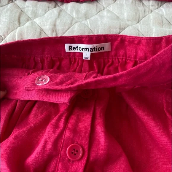 Reformation Orzo Linen Skirt - NWOTSize 0, excellent condition, really pretty pink color. 🌺 It’s too big for so it’s only been worn once or twice. (Fits true to size, I’m just usually a 00 for reference)I do have the matching top, wasn’t planning on selling both because the top fits me, but let me know if you’d be interested in the matching top too!