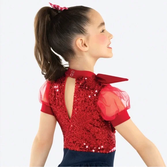 Multiple available in my closet!This vibrant kids costume features a striking red and blue design, perfect for jazz or musical theater performances. The playful style and bold colors make it a standout choice.DETAILSPrinted matte spandex and sequin spandex dressFaux denim waistlineFaux denim skirt with attached organdy ruffles edged in polka dot trimSnap closure at the necklineAttached organdy sleeves Attached matte spandex cuffs and collar with attached bowAttached fringe trim on the front bodiceKeyhole backAttached matte spandex briefsTop-linedGlitter-free!INCLUDES★Hair bow with clip★Hanger★Garment bag Size MC, CM, Medium ChildStyle Code RC23934 This costume is Acrobatic Arts approved for AcroDance 2025 Revolution Costume Collection p. 297Excellent condition, clean/no visible stains