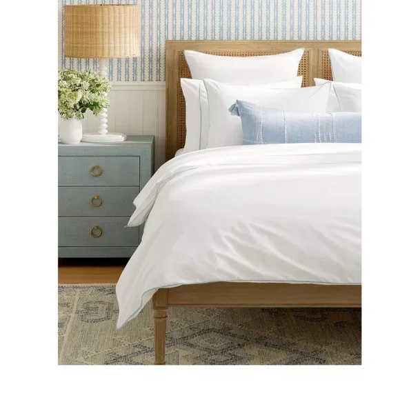 Dimensions & CareMade in Portugal.STANDARD 100 by OEKO-TEX® Certified (2539CIT CITEVE): Safely tested to be free from harmful chemicals.100% combed cotton percale.1/4" inserted sateen flat piping.Tailored mitering for a clean finish.French seams.310 thread count.Fabric-covered button closure.Inner ties keep the cover in place.Machine wash. Tumble dry low and pull straight out of dryer to avoid wrinkles..King/Cal King: 108" x 92".Not used I bought opened package put in closet and forgot. I have now changed my mind on color.