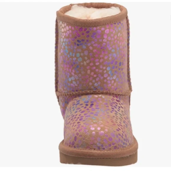 Scaling down our grown-up Classic Boot, this kids' update is made from the same rich suede, adding metallic spots for a shimmery statement. Down below, the super-light sole offers great traction and longevity, while the cozy UGGplush™ lining keeps little feet happy. Built to move the way kids do, each boot incorporates a cushioned foam insole and pairs with anything from jeans to dresses.Treadlite by UGG™ Proprietary compound which increases cushioning and traction for a supremely lightweight, ultra-durable sole.Shaft measures approximately Calf High from archBoot opening measures approximately 12" aroundSuede upperPrinted suede17mm UGGplush™ 80% upcycled wool, 20% lyocell lining17mm UGGplush™ 80% upcycled wool, 20% lyocell insoleFoam footbedTreadlite by UGG™ outsole for comfortTextile binding made from 100% recycled polyester fibersWoven heel label with UGG® logo