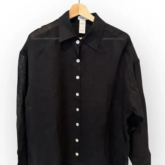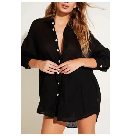 This oversized cover-up shirt woven from lightweight linen is a must-pack companion for your next sunny getaway.Size: Small=6Approximate measurements laying flat:Length 31.5"Bust 48"Front button closureSpread collarLong sleeves with button cuffsCurved high-low hem100% linenHand wash, dry flatCondition: New without tags
