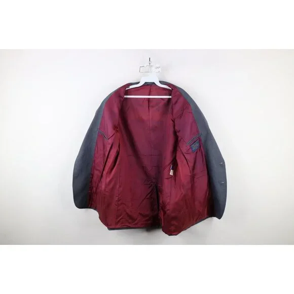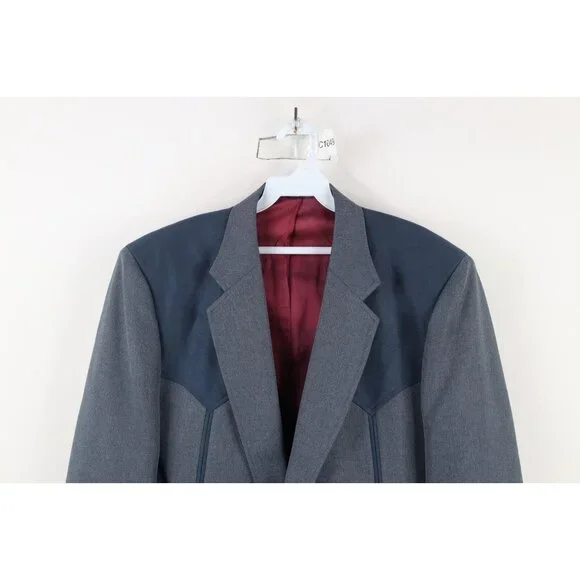Vtg 90s Rockabilly Mens 44R Western Rodeo 2 Button Blazer Suit Jacket Blue USAMens JacketLining discolored. Blemishes on front, cuffs and sleeves. USA made. 19 inches shoulder seam to shoulder seam. 25 inches shoulder seam to cuffMens size 44RMeasurements are:23 inches underarm to underarm32 inches top to bottomBluePolyester Check out my other items in my store!C1049