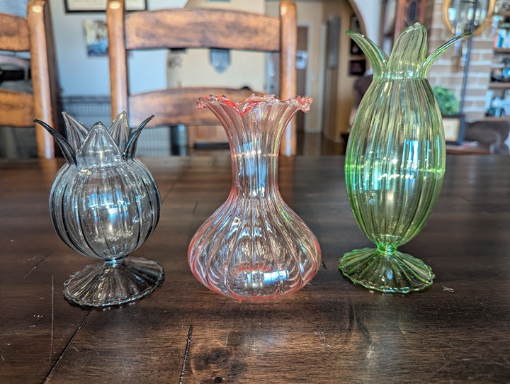 Bud vases provide the perfect way to display single flowers or small spring bouquets. Crafted of colored glass with fluted sides, they each have a distinctive shape that works well grouped together or displayed individually. The versatile vessels are also ideal for rooting small cuttings in water.